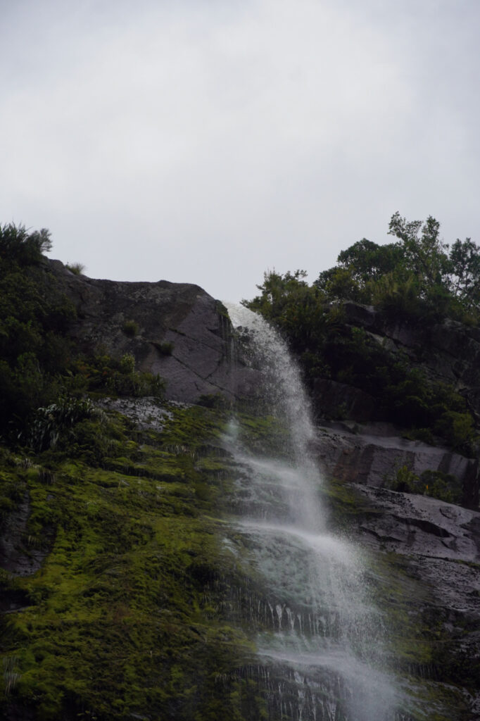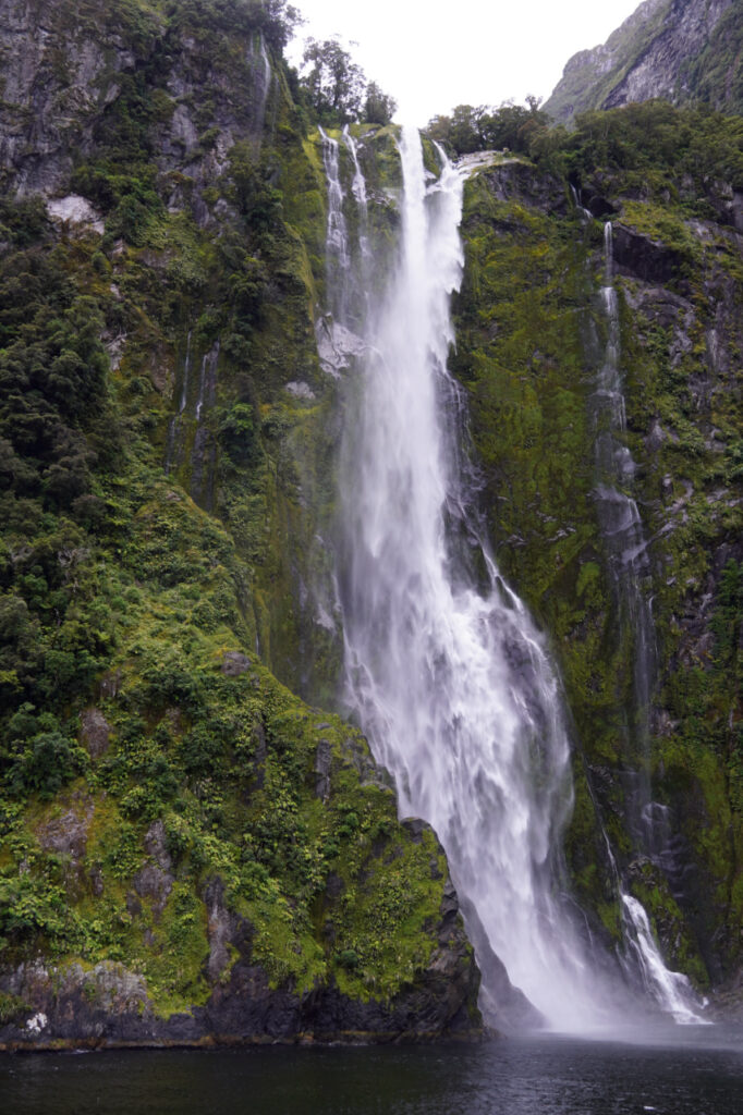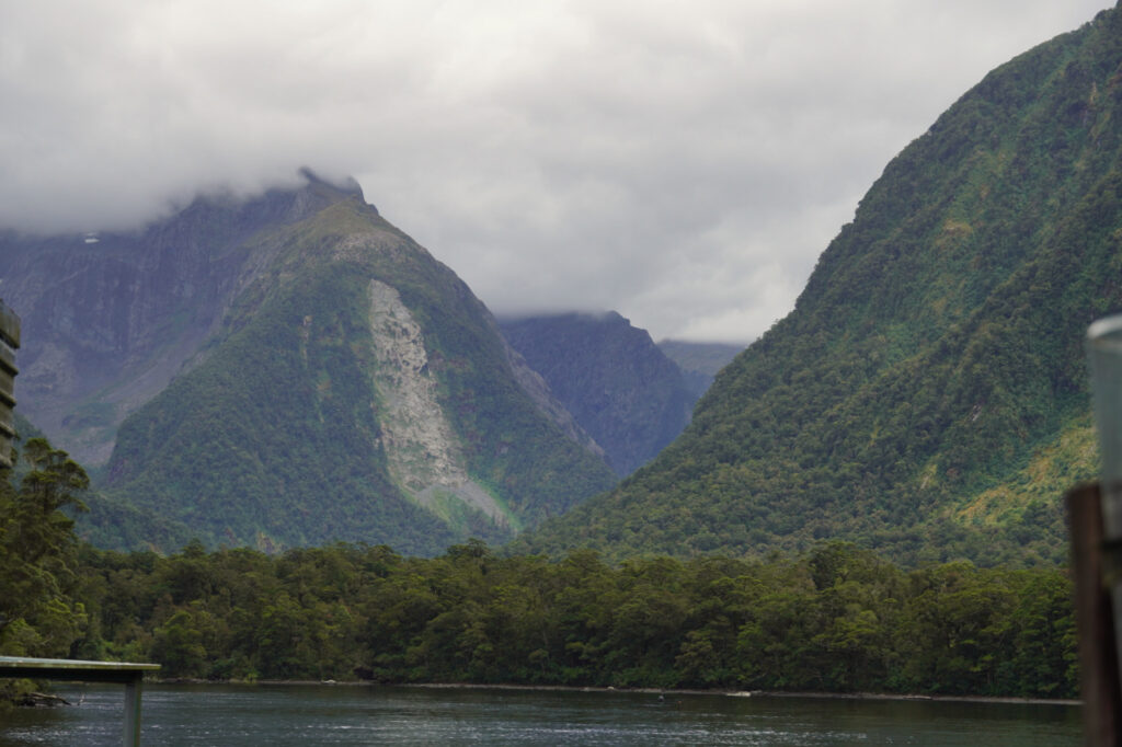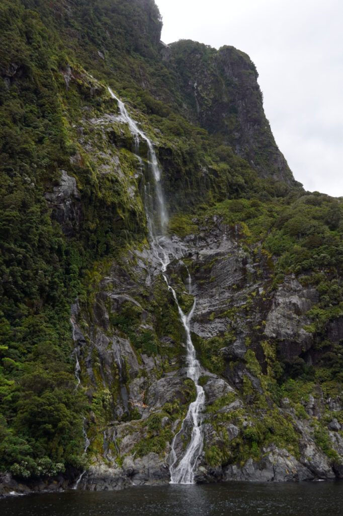 Auf unserer Fahrt zur Mündung des Milford Sound kommen wir an allerhand Wasserfällen vorbei. Wir lernen, dass es einen Milford Sound eigentlich gar nicht gibt. Er gehört eigentlich zur Gattung der Fjorde, da Sounds einen V-förmigen Querschnitt haben und von fließendem Wasser in die Landschaft geschnitten werden. Der Milford Sound ist aber von einem Gletscher geschaffen und hat einen U-förmigen Querschnitt. Außerdem gibt es an der Mündung eine Endmoräne, wo er von fast 300 m an der tiefsten Stelle auf knappe 30 m abflacht.