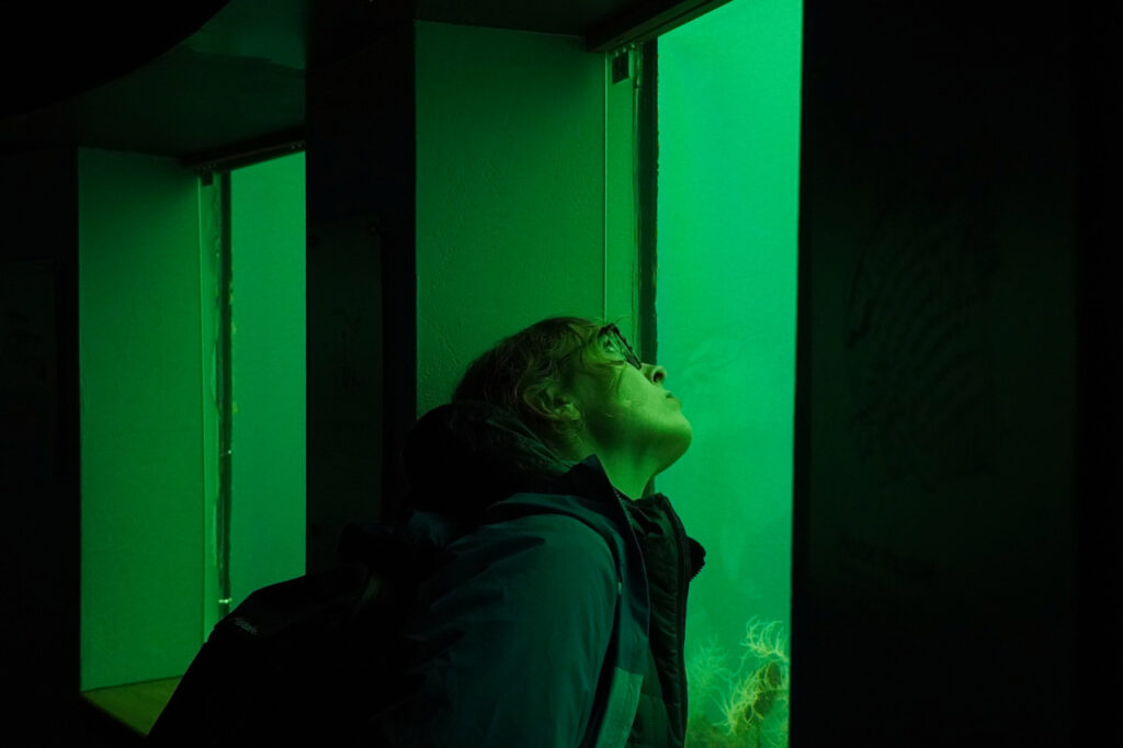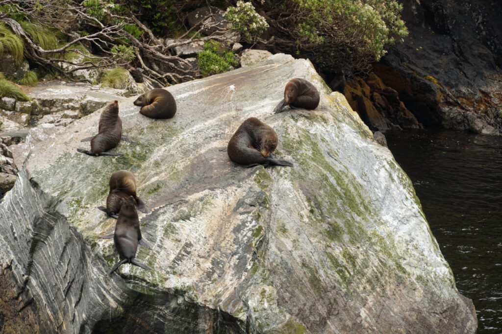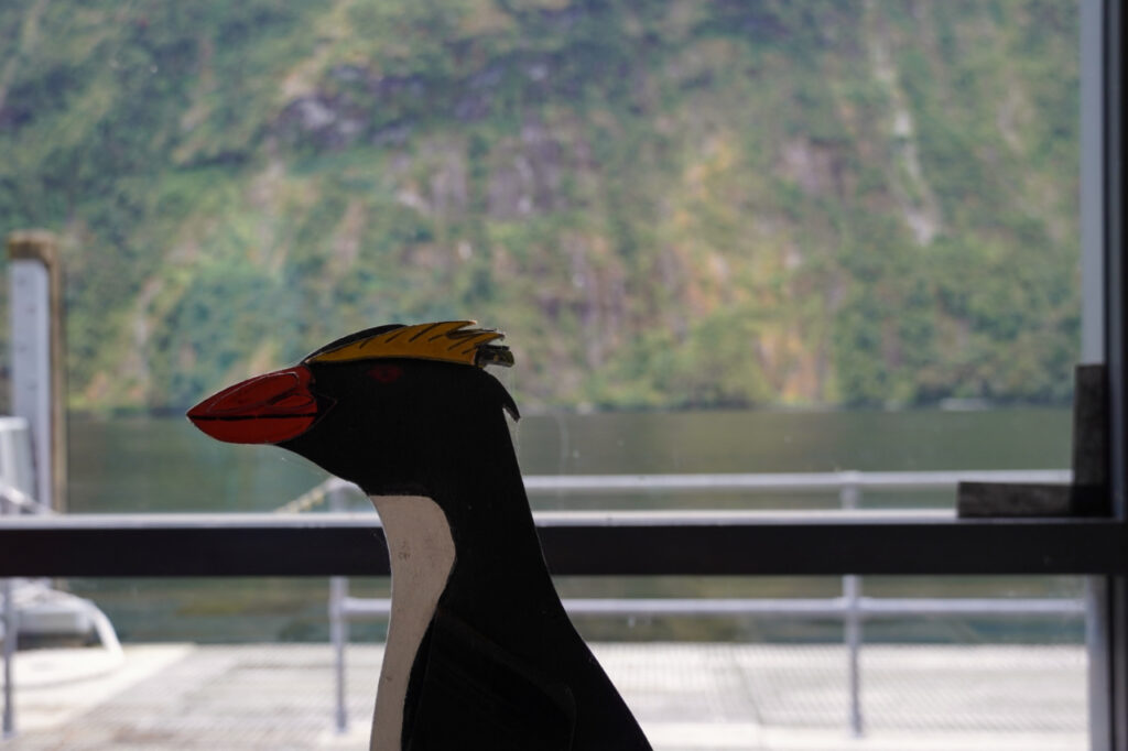 Auf der Rückfahrt stoppen wir an einem Unterwasserobservatorium in einem Seitenarm und können das rege Treiben vor den Scheiben beobachten: Black Corals, diverse Fische, Seegurken und Seesterne. Allesamt Wildtiere, die aus freien Stücken dort abhängen und keineswegs für die Touristen angelockt werden. Wieder an der Oberfläche gibt es noch einen kurzen Vortrag zu den Pinguinen, die im Sound zu finden sind (sehr zum Leidwesen von Luisa heute abwesend) und wir lernen etwas über Baumlawinen: Auf den steilen Felshängen gibt es keinen Mutterboden. Stattdessen wachsen dort direkt auf dem Fels Moose. In den Moosen wurzeln Bäume, die sich auch untereinander verankern. Wenn einer von ihnen einem Sturm zum Opfer fällt, reißt er viele andere mit sich. Es passiert ungefähr das gleiche, als wenn man beim Tapezieren an einem Tapeten-Schnipsel zieht.