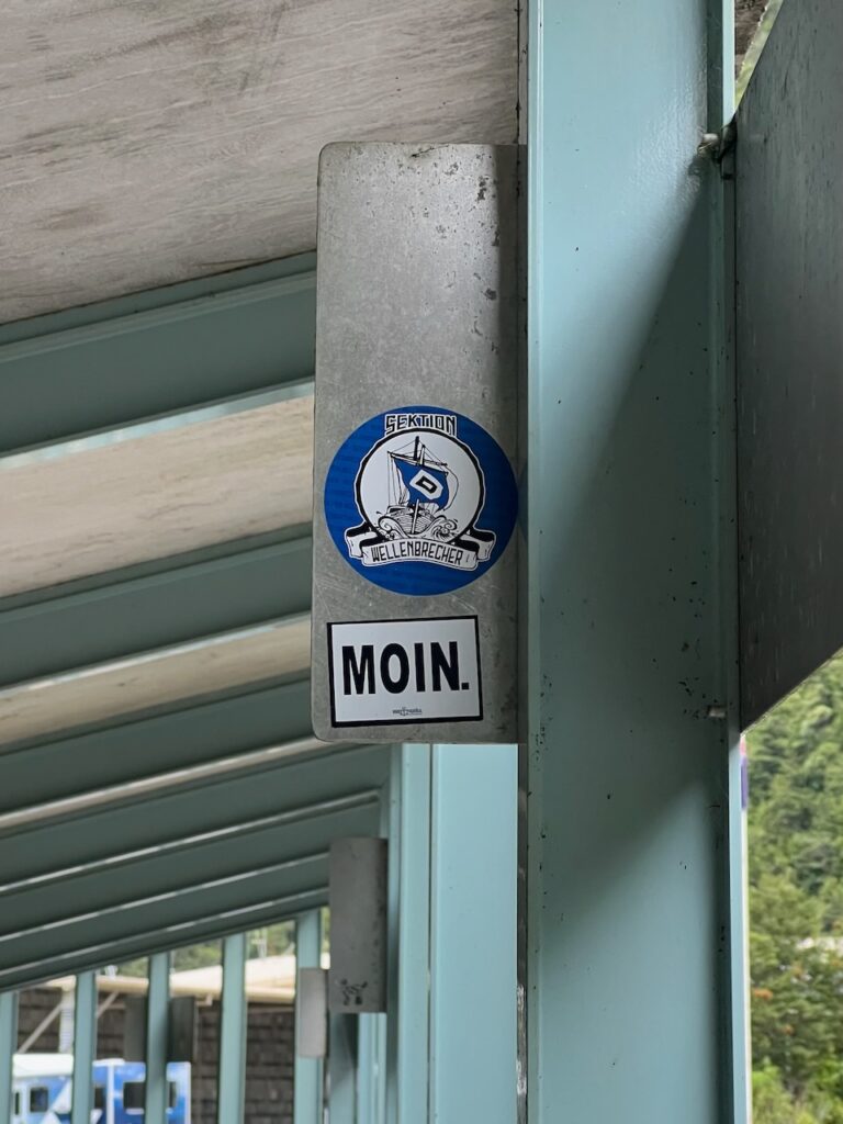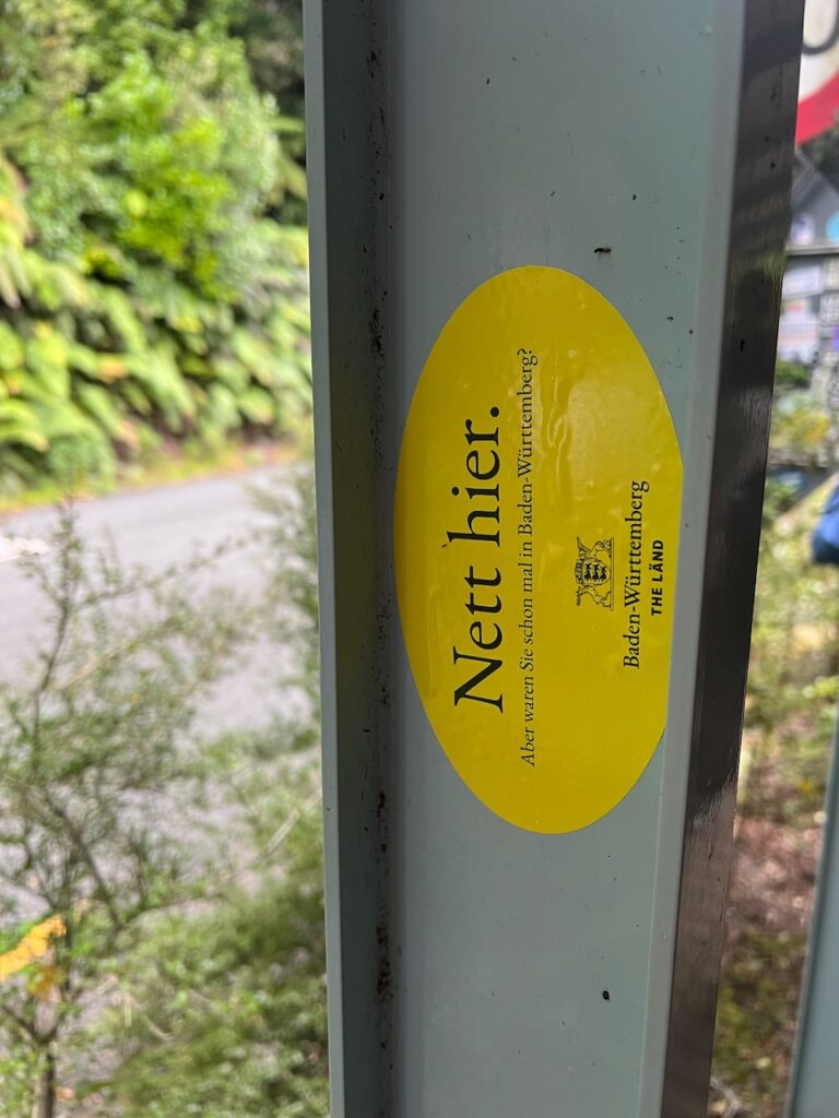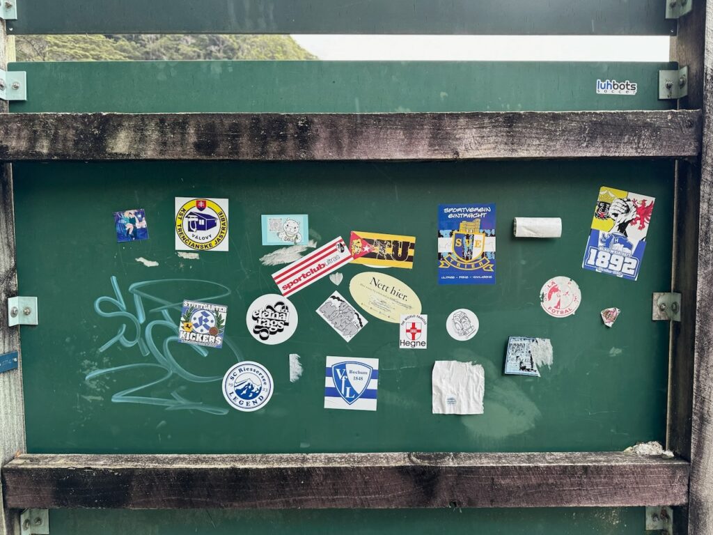 Am Milford Sound scheint schon der ein oder andere Deutsche gewesen zu sein. Die Pfeiler der Überdachung des letzten Stücks Fußweg sind durch diverse Aufkleber von deutschen Vereinen verziert worden – und Baden-Württemberg darf natürlich auch nicht fehlen.