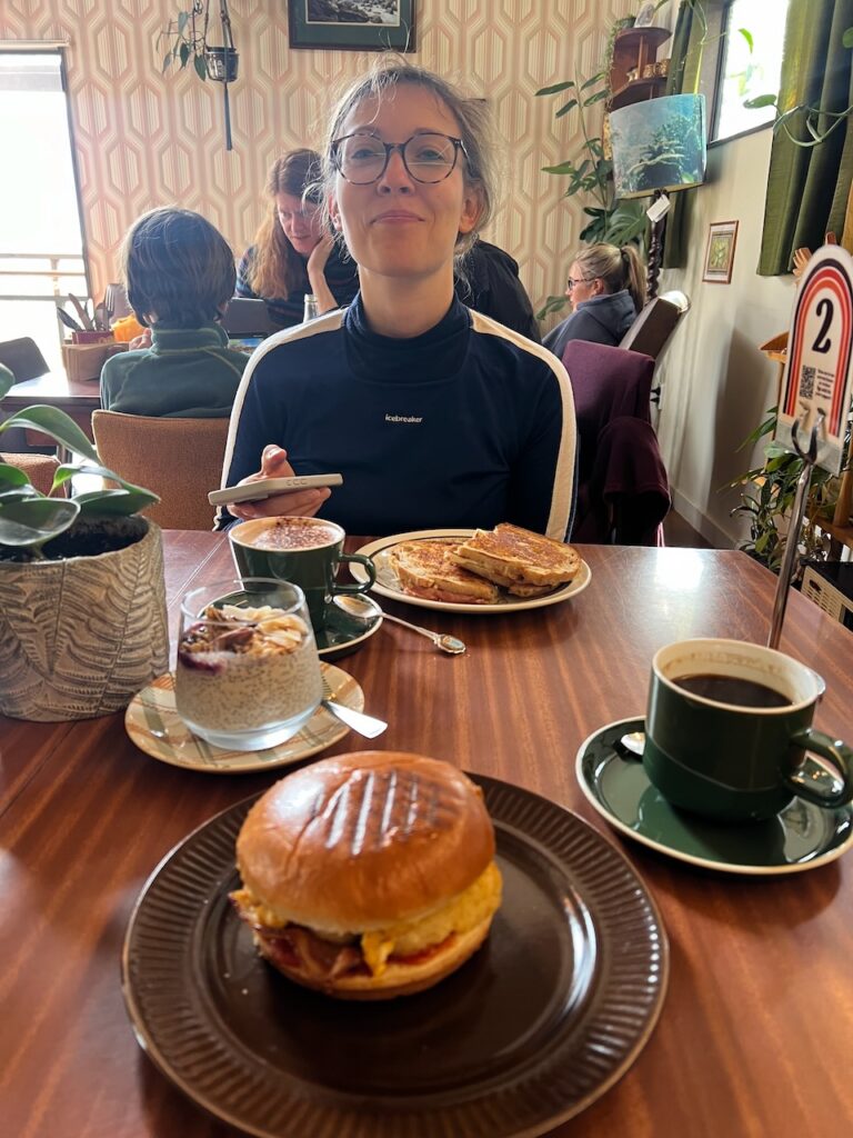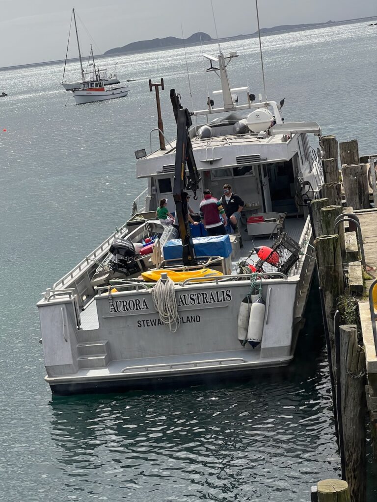 Wir stehen auf und bauen unser Zelt ab. Das meiste ist auch über Nacht oder im Sonnenschein der frühen Morgenstunden schon wieder getrocknet. Nach dem Rakiura Track und der etwas nassen Nacht, belohnen wir uns mit einem Frühstück quasi gegenüber in der Snuggery. Das Personal ist super nett, das Essen und der Kaffee sind lecker. Hier kriegen wir gut die Zeit bis zum Ablegen der Fähre überbrückt.