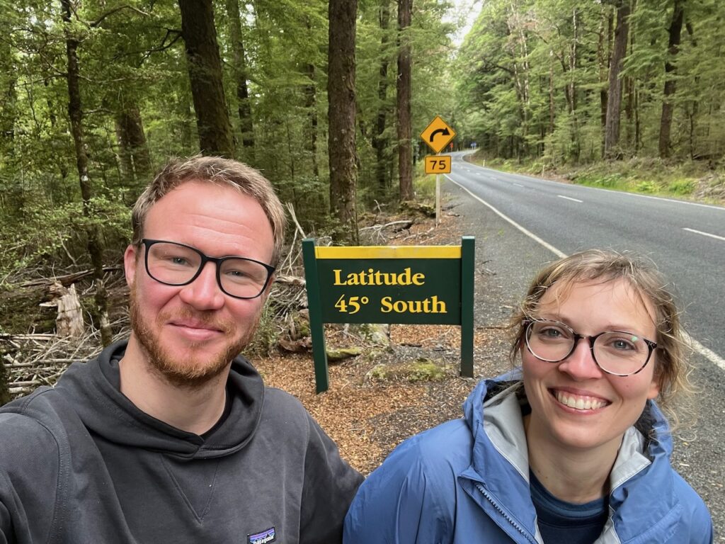 Auf der Rückfahrt wollten wir eigentlich noch zu den Humboldt-Fällen abbiegen. Nach einem Blick auf die Tankanzeige, lassen wir den 40 km Umweg lieber, nur um dann doch mit knapp einem halben Tank in Te Anau anzukommen. Das Wetter war aber ohnehin eher ungemütlich. Dennoch legen wir einen Zwischenstopp am 45. Breitengrad ein. Da er direkt an der Straße ausgeschildert ist, benötigt das nicht einmal zusätzlich Benzin und das Wetter ist auch egal.