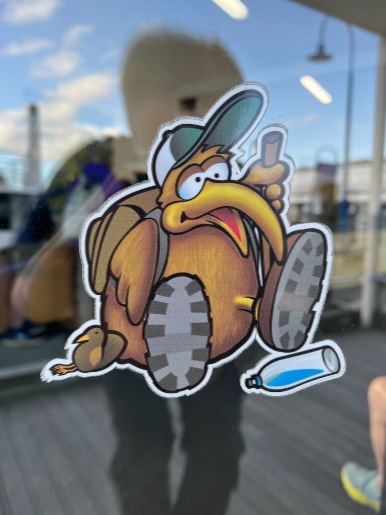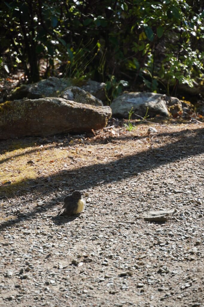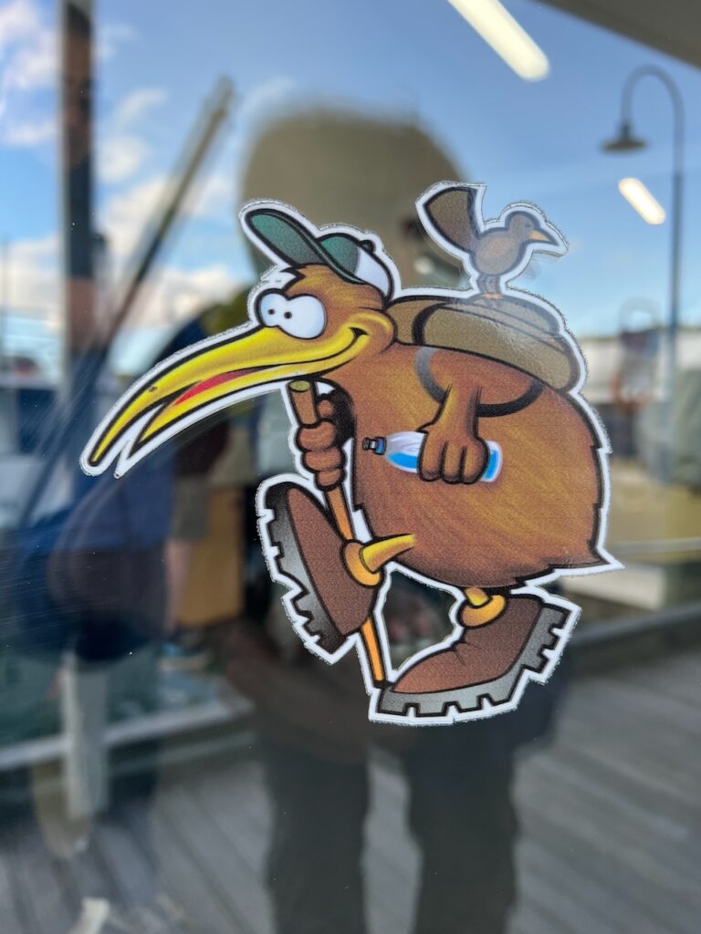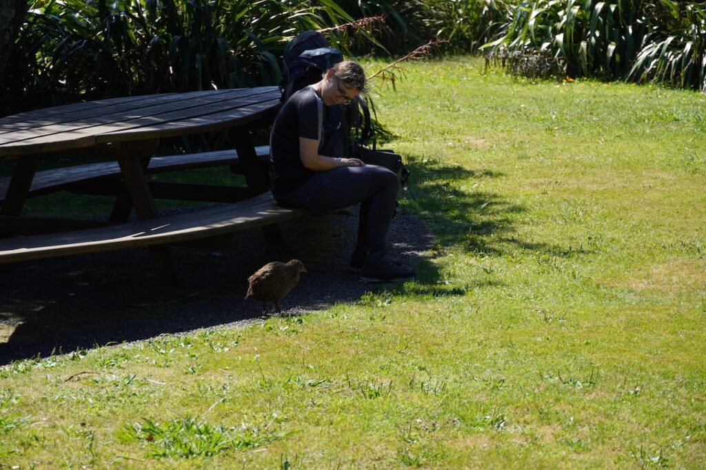 Die neugierigen Wekas werden etwas aufdringlich. Erst dekorieren sie Lulus Wanderstiefel um und als wir den Tisch fürs Abendbrot decken, mopsen sie unsere Brötchentüte. Bevor sie allerdings komplett im Gebüsch verschwindet, erobere ich sie zurück. Beim Abendessen klingt irgendwas nach Specht, ist aber keiner. Sie haben vorhin nicht nur an Lulus Wanderstiefeln Spaß gehabt, sondern auch einen Quetschi ergattert und hacken nun darauf rum. Zum Schlafen holen wir später alles aus dem Vorzelt ins Innenzelt.