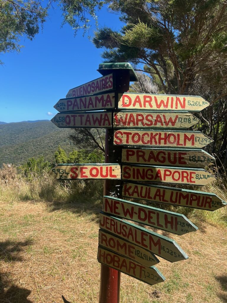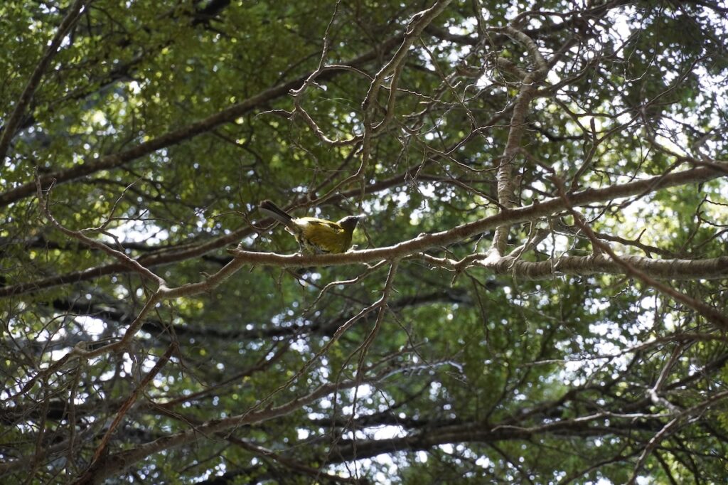 Unser erster Stopp ist die Vogelschutzinsel Motuara Island. Während unseres Besuchs sollen wir unsere Rucksäcke unten lassen. Das macht es uns leichter auf die Spitze des Hügels zu kommen und der Captain des nächsten Bootes weiß dann außerdem, dass noch Leute irgendwo über die Insel pirschen und er eventuell ein paar Minuten warten sollte, ob noch jemand mitfahren möchte. Wir stellen die Rucksäcke ab und gehen strammen Schrittes los. Irgendwie ist es zu dunkel um irgendwas erkennen zu können. Wir haben unseren Sonnenbrille noch auf und die normalen Brillen sind in den Rucksäcken. Also Kehrtmarsch zum Brillentausch und nochmal Anlauf nehmen. Es geht einen kurzen Weg den Berg rauf, oben steht ein Aussichtsturm und unterwegs ein paar Infotafeln. Außerdem lassen sich einige Vögel blicken und wir sehen Zikaden, die uns schon tagelang beim Wandern in den Ohren lagen. Wir befinden uns hier übrigens nördlich von Wellington, obwohl wir uns noch in den Fängen der Südinsel befinden. Um nach Wellington zu kommen, hätte man unterwegs in östlicher Richtung abbiegen müssen.