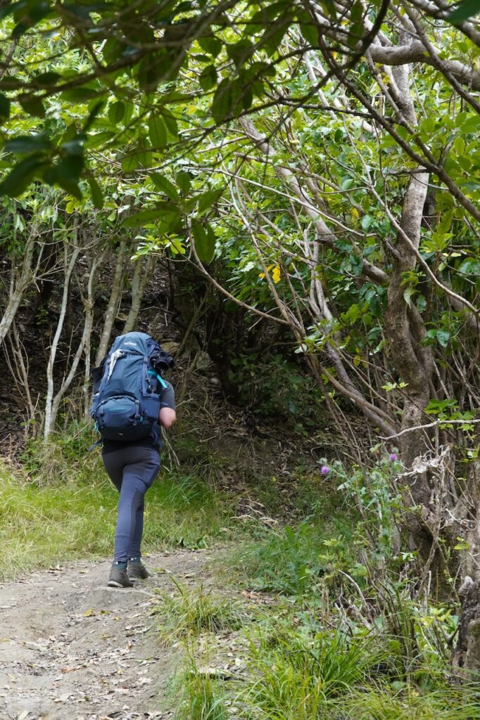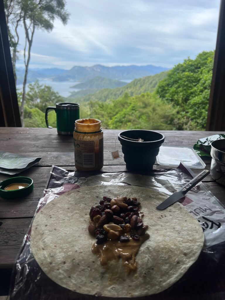 Die Rucksäcke sind auch immer noch schwer. Langsam saugen sie sich zusätzlich mit Wasser voll, was sie nicht unbedingt leichter macht. Das trägt nicht sonderlich zur Heiterkeit bei. Aber diesmal wollen nicht nur von Instant-Porridge morgens und Instant-Nudeln abends leben. Davon hatten wir auf dem Kepler Track wirklich die Nase voll. Stattdessen haben wir Wraps dabei, Erdnussbutter, Bananen, Käse, Salami, Mikrowellenreis und Dosenhühnchen. Die Nussmischung mit Cranberries, Müsli- und Nussriegel, Äpfel/Birnen sowie Quetschies und Tee- und Kaffeebeutel dürfen natürlich auch nicht fehlen.