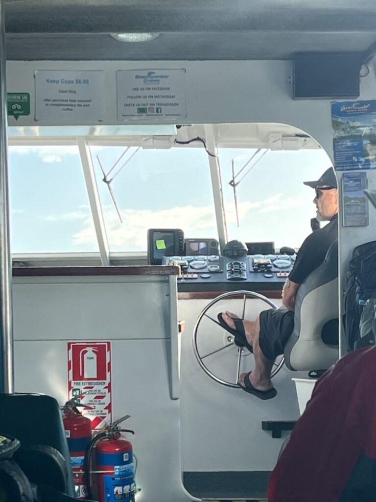 Wir sitzen im Schatten vor der Rezeption mit angeschlossenem Gemeinschaftsraum. Lulu ruft die Nummer an, die neben der Rezeptionstür hängt. Die Dame kümmert sich gerade um irgendwas und „will be there in a Minute.“ Es werden dann doch eher 30 Minuten. Eigentlich haben wir auch schon gebucht und bezahlt und wollen nur sagen, dass wir da sind, Kleingeld zum Duschen wechseln und jeder ein Eis. Ein paar Gratis-Tipps nehmen wir auch dankbar entgegen: Im Wald gibt’s Glühwürmchen und das Wasser in der Bucht ist phosporeszierend. Es braucht dafür nur etwas Bewegung.