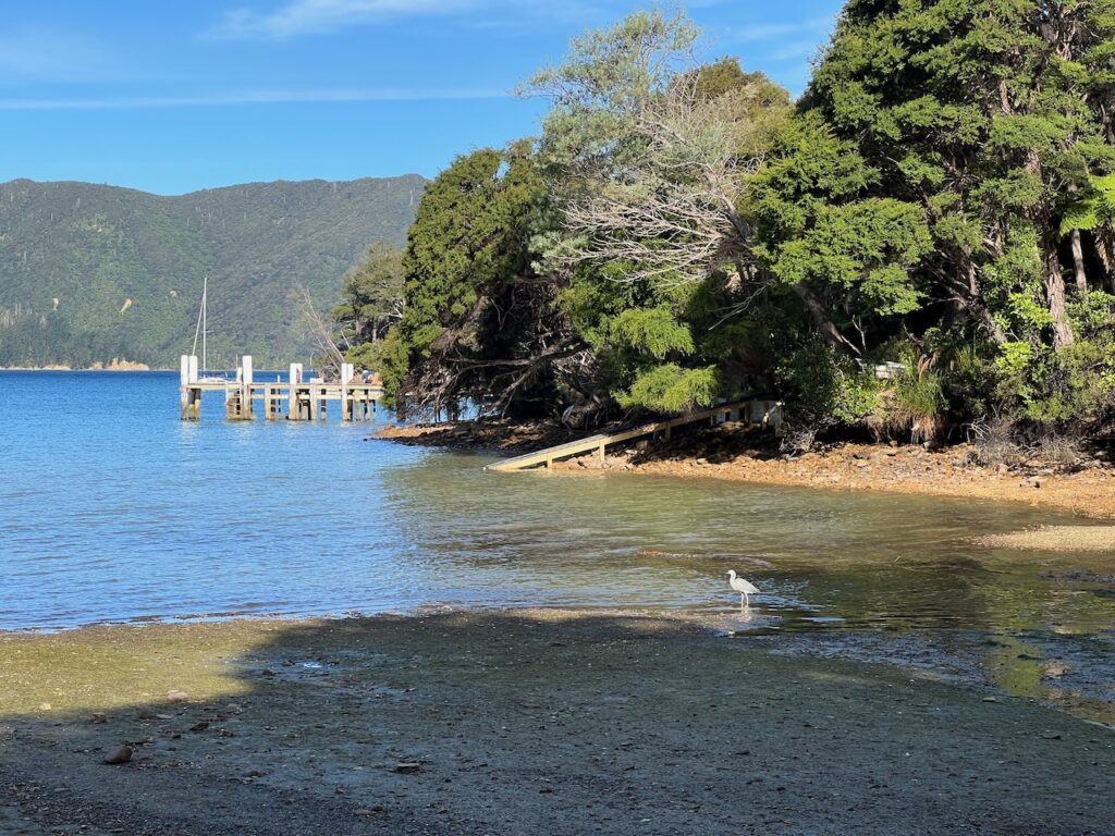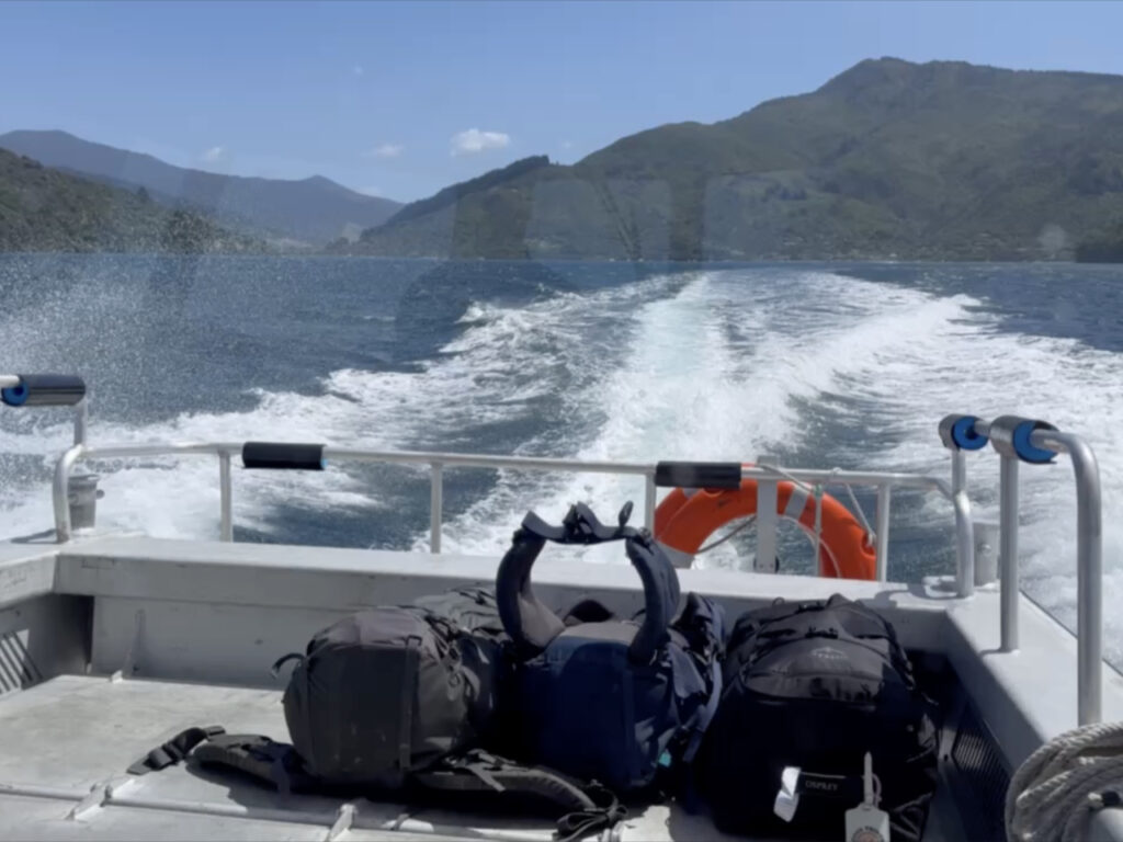 Es heißt mal wieder früh aufstehen, denn um 7:30 Uhr müssen wir für das Wassertaxi einchecken, das uns zum Start des Queen Charlotte Tracks bringt. Unterwegs erzählt der Captain (oder Wasser-Taxifahrer?) von den Möchtegern-Sounds im Süden, die eigentlich alle Fjorde sind, und lässt alle Passagiere mit stolzgeschwellter Brust wissen, dass wir uns hier auf einem echten Sound (deutsch: Sund?) befinden. Er rät mir zudem, mein abgefülltes Wasser aus dem Pictoner Wasserhahn wegzukippen und bei Ships Cove Wasser aus dem kleinen Strom zu holen. Besseres Wasser kann man in der ganzen Gegend nicht finden, erst recht nicht in Picton. Außerdem erzählt er, wie in der Gegend versucht wird, die ursprüngliche Flora und Fauna wiederherzustellen und auf welchen Teilen des Weges wir noch die ursprüngliche Bewaldung finden können.