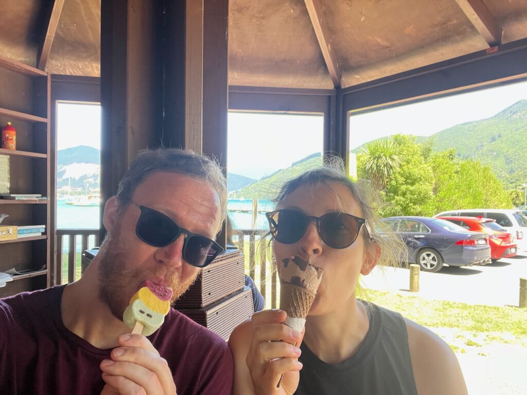 Wir ziehen einfach durch und erreichen Anakiwa mit ca. zwei Stunden Puffer und somit eine Stunde früher, als die Hinweisschilder für die Strecke vorausgesagt haben. Wir setzen uns in eine kleine Hütte. Ich, weil ich Schutz vor der Sonne suche und Lulu, weil sie Schutz vor dem Wind sucht. Gegenüber wird aus einem alten Wohnwagen Kaffee, Tee, Eis und diverse Snacks und Kaltgetränke verkauft. Lulu setzt sich in der Wartezeit an die weitere Reiseplanung. Ich fange an, die Erlebnisse niederzuschreiben.