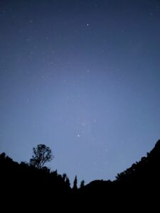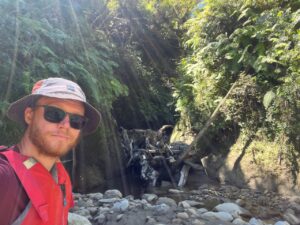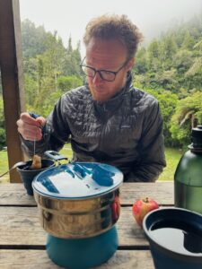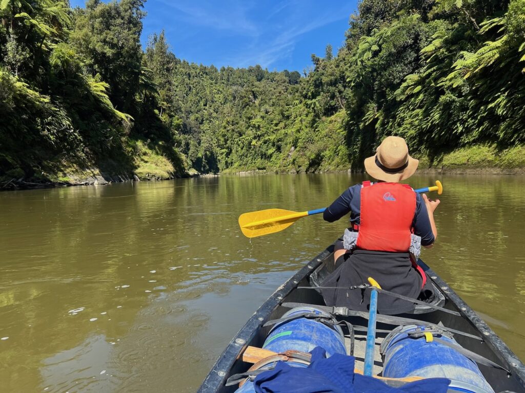 Während wir unser Zelt aufbauen kommen diverse Leute den Hang hoch und fragen nach dem Weg zur Hütte. „Einfach immer weiter geradeaus.“ Abgesehen von uns steht heute Abend noch ein zweites Zelt auf der Wiese. Ein paar weitere Camper haben es sich auf den kleineren Terrassen weiter unten bequem gemacht. Wir machen uns erstmal Abendbrot. Wasser gibt es aus Pumpwasserhähnen. Im Gegensatz zu den fragil wirkenden Exemplaren auf dem Tongariro Northern Circuit, werden diese hier mit dem Fuß bedient. Aber wie schon auf den anderen Wanderwegen stehen auch hier die Warnschilder, dass das Wasser unbehandelt ist und unter Umständen nicht für den direkten Verzehr geeignet. Als wir da so sitzen und unsere Kreationen verspeisen, kommt ein Maori vorbei. Wir halten ihn zunächst für den Hütten-Ranger, morgen wird sich jedoch rausstellen, dass er der Paddel-Guide einer vierköpfigen Rentnertruppe ist. Er gibt uns Tipps, wie wir am besten die Fledermäuse sehen können, die es hier gibt. Wir sollen bei Sonnenuntergang den Himmel rund um den einen großen Baum, der alle anderen am Hang überragt, im Auge behalten. Der Sonnenuntergang kommt und geht, wir gucken die ganze Zeit, können aber keine Fledermäuse sehen. Stattdessen gehen wir runter an den Fluss und bewundern die Vertäuungskünste der anderen. Einige haben ihre Boote an großen Stücken Treibholz festgemacht. Das kriegt keiner weggetragen, aber falls das Wasser steigen sollte, macht das Treibholz halt, was Treibholz so macht und das Boot ist auch weg. Andere haben sich an Wurzelenden festgemacht, die aus der Erde ragen. Die Enden zeigen dabei dummerweise in Flussrichtung und die Schlingen sehen so aus, als könnte der Fluss sie einfach von der Wurzel ziehen. Soll nicht unser Problem sein, wir liegen weit oben auf dem Trockenen. Stattdessen genießen wir noch ein wenig das Abendpanorama am Fluss mit Mama- und Baby-Bergziege gegenüber. Im Dunkeln erreichen wir das Zelt. Der Sternenhimmel ist mal wieder atemberaubend. Die ISS zieht kommt auch vorbei und sagt „Hi!“