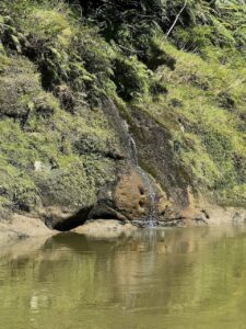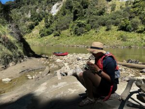 Nach etwa einer Stunde setzen wir unser Kanu auf eine Steinbank am linken Flussufer. Die Sonne brennt mittlerweile ins Tal des Whanganui Rivers. Wir brauchen erstmal eine kleine Pause. Sonnencreme auftragen, Snacks und Wasser in den Körper pumpen und dann gehts weiter. Immer wieder gibt es links, rechts und in der Mitte irgendwelche Hinternisse. Immer wieder durchpaddeln wir kleinere und größere Stromschnellen. Der Strom gibt uns zwar einen gewissen Vortrieb, aber die ständig nötigen Korrekturen kosten Kraft. Lulu wird kreativ bei der Benennung der Hindernisse: Ein Holzhaufen wird zur Biberburg. Große Holzhaufen heißen Biberpalast. Komische Felder aus Ästen und Baumleichen heißen Bibermassaker. Zweieinhalb Stunden nach der ersten Pause setzen wir unser Kanu wieder an Land. Eine kleine Steinbank, ein bisschen Sand und eine Kluft mit einem Wasserfall laden zum Verweilen ein. Dazu gibt es ein paar mehr Snacks und Wasser, bevor wir uns auf den letzten Abschnitt für heute machen.