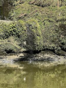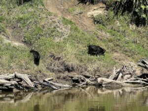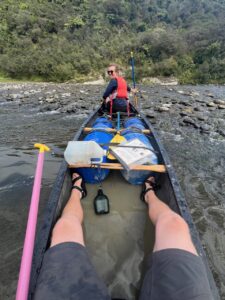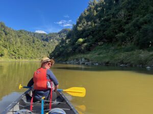 Wir erreichen Mangaio Rock, den Felsen vor dem wir gewarnt wurden und der unter allen Umständen auf der linken Seite zu passieren ist. Ich hatte bei der Einweisung die Bilder immer so gelesen, dass wir uns durch den sehr schmalen Kanal quetschen müssen, der zwischen Fels und Ufer liegt. Stellt sich raus, wir kommen aus der anderen Richtung und die linke Seite ist fast die komplette Breite des Flusses. Welcher Irre würde denn freiwillig rechts an dem Felsen vorbeipaddeln? Wir halten uns schön weit links –vielleicht etwas zu weit links. Unser Boot schrammt mit dem Boden über eine Steinbank, sodass wir fast steckenbleiben.