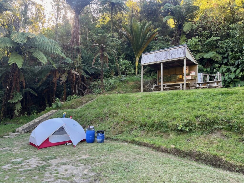 Unser Tagesziel nach 29 Kilometern ist heute Tīeke Kāinga. Hier trifft Campingplatz und Hütte auf Marae. Bei unserer Ankunft wird uns erklärt, wo wir unser Zelt errichten dürfen und in etwa 30 Minuten soll die offizielle Begrüßungszeremonie stattfinden. Wir suchen uns einen Platz in der Nähe eines Tisches mit Bänken und daneben einem Bananenbaum. Ungefähr 45 Minuten später heißt es, dass wir noch auf die letzten Gäste für heute warten, es aber in zehn Minuten losgehen soll. Nochmal 15 Minuten später kommen die Gäste sogar tatsächlich an und haben ungefähr fünf Minuten ihr Zeug aus dem Kanu zu laden, auf der Wiese zu parken und sich dann mental auf die Begrüßungszeremonie vorzubereiten.