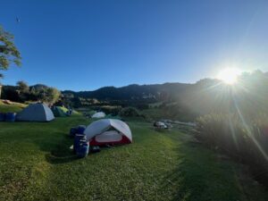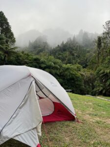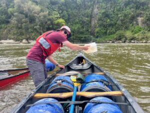 Wir schleppen unser Kanu eine Ebene nach oben. Die Einweisung sagte, dass wir das Kanu nicht direkt am Fluss lassen sollen, da es sonst bei steigendem Wasserspiegel am nächsten Morgen vielleicht nicht mehr da liegt. Wir sind auch die einzigen, die das so machen. Danach schnappen wir unsere Fässer und schleppen sie noch ein paar Etagen rauf, bis wir die Zeltwiese mit Kochhütte erreicht haben, die in Terrassen angelegt ist. Hier blocken wir erstmal unser bevorzugtes Stückchen Wiese mit den Fässern. Ein Stückchen weiter, an dem Verbindungsweg zwischen Zeltwiese und der Hütte, die es hier auch gegeben hätte, befinden sich die Toiletten (Standardmodell Plumpsklo). Schließlich folgt ganz hinten die Hütte. Dort tragen wir unsere weiteren „Wanderabsichten“ in das dafür vorgesehene Buch ein, damit Such- und Rettungskräfte im Notfall unseren Weg nachvollziehen können. Zurück auf der Zeltwiese fällt uns auf, dass es hier auch ein Buch für die Camper gegeben hätte und das andere vermutlich nur für die Hüttenbewohner gedacht war. Wir tragen uns hier auch einfach nochmal ein, doppelt hält schließlich besser.