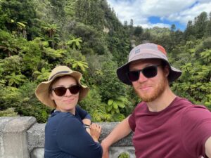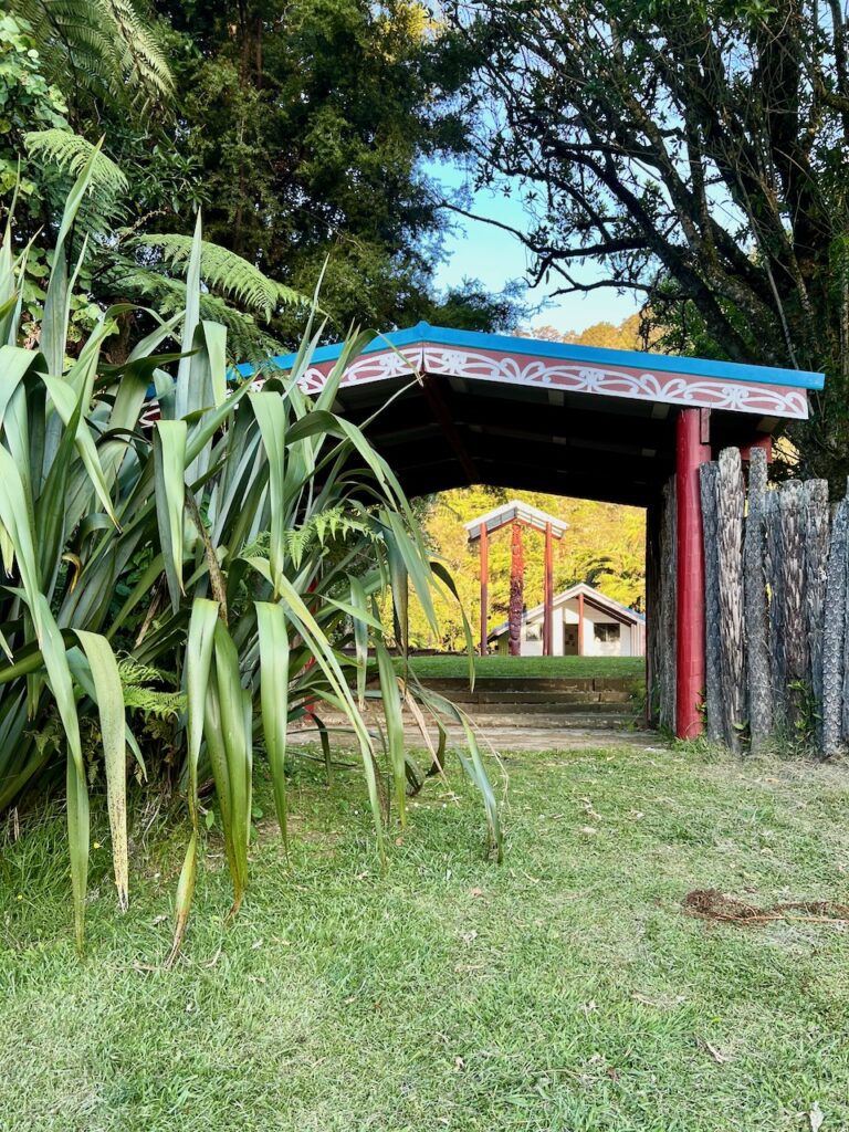 Die Frauen gehen zuerst durch das offizielle Tor des Marae, müssen aber auf den hinteren Bänken platznehmen. Zuerst hält Stacy, der Maori-Guide der Rentnergruppe, eine Rede und die Gastgeberin singt ein Maori-Lied. Daraufhin ist es die Aufgabe der Gruppe von Gästen eine Antwortrede zu halten. Zum Glück kennt sich einer der Rentner in der Maori-Kultur aus und erwidert Stacys Rede. Die ganze Gruppe soll ein Maori-Lied singen. Einige scheinen es zu kennen und singen mit, ich stehe nur etwas bedröppelt in der ersten Reihe rum. Anscheinend konnten wir aber die gastgebende Seite überzeugen, dass unsere Gruppe keine bösen Absichten hat und wir werden herzlich dazu eingeladen, die Nacht hier zu verbringen. Jeder aus unserer Gruppe wird von Stacy und der Gastgeberin mit einem Hongi begrüßt. Wir dürfen uns nun frei über das komplette Areal bewegen.