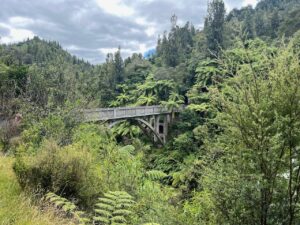 Ein Highlight des heutigen Tages ist die Bridge to Nowhere. Rückkehrern aus dem Ersten Weltkrieg wurde hier in der Gegend Land geschenkt. Eine Holzbrücke verbandt zwei Siedlungen. Die Siedler erwarteten aber eigentlich eine größere Straßenanbindung, weshalb die verrottende Holzbrücke durch eine Stahlbetonbrücke ersetzt werden sollte. Als die endlich irgendwann fertig war, waren kaum noch Siedler übrig, da das Leben auf dem geschenkten Land einige Härten mit sich brachte. Das endgültige Aus kam 1944, als die Regierung beschloss, dass die Straße nicht weiter unterhalten wird. Böse Zungen behaupten, dass die Brücke heute öfter überquert wird als zu ihrer aktiven Zeit. Eine besondere Herausforderung bietet der Ausstieg aus dem Kanu, um die ca. einstündige Wanderung (hin und wieder zurück) überhaupt antreten zu können. Da wir bis hierher auch etwas über die Hälfte der heutigen Strecke zurückgelegt haben, machen wir erstmal eine Snack-Pause, nachdem wir den schwierigen Ausstieg aus dem Boot geschafft haben. Dann machen wir uns auf den Weg zur Brücke.