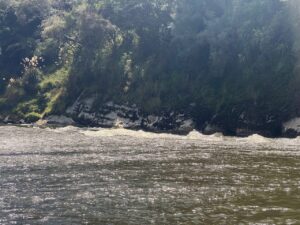 Heute schaffen wir es doch tatsächlich mal vor 9 Uhr in Bewegung zu kommen. Trotzdem sind wir die letzten aus unserer Gruppe. Bis 14 Uhr müssen wir es schaffen, die letzten 21,5 Kilometer hinter uns zu bringen. Die größten Spaßmacher liegen noch vor uns. Bei der Einweisung am ersten Tag wurde vor zwei Dingen insbesondere gewarnt: Ein großer Felsen, der unbedingt auf der linken Seite zu umfahren ist und eine Stromschnelle mit dem Spitznamen 50:50. Der Wasserstand ist heute nochmal niedriger als gestern, was für uns noch mehr Dinge bedeutet, die aus dem Wasser gucken und noch mehr Stromschnellen, wo vorgestern vielleicht keine gewesen wären.