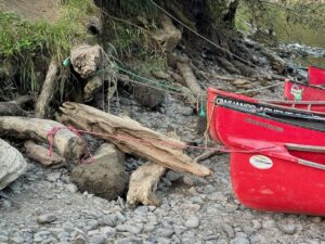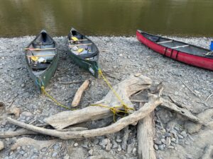 Nach einiger Zeit, die sich deutlich länger anfühlt als erwartet, sind wir da. Alle dürfen an den Toiletten aussteigen und bei Bedarf sogar nutzen. Der Bus fährt schon mal runter zum Fluss. Als wir unten ankommen, helfen wir dabei die Kanus vom Anhänger zu ziehen und ans Flussufer zu legen. Jedes Kanu kriegt ein Seil, eine Pütz und eine Karte. Zur Ausrüstung gehören pro Kanu außerdem drei Paddel: Ein kürzeres für den vorderen Platz und zwei längere, wovon eins für den Steuermann und eins als Ersatz gedacht ist. Einige Kanus haben Rückenlehnen als Upgrade, das man vorher buchen konnte. Wir schnappen uns einfach das erste Kanu und legen unsere Fässer davor. Der Busfahrer erklärt, wie die Fässer am besten vertäut werden und wo und wie man am besten Seil, Pütz, Karte und Ersatzpaddel anbringt. Die Erklärungen finden an unserem Kanu statt, damit sind wir erstmal durch mit der Einrichtung und alle anderen dürfen ihre Kanus präparieren.